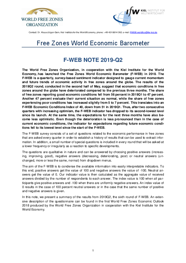 The results of the 2019Q2 round, conducted in the second half of May, suggest that economic conditions in free zones around the globe have deteriorated compared to the previous three months. The share of free zones reporting good economic conditions fell from 56 percent in 2019Q1 to 47 percent. Another 47 percent evaluate their current situation as normal, while the share of free zones experiencing poor conditions has increased slightly from 5 to 7 percent. This translates into an F-WEB Economic Conditions Index of 40, down from 51 in 2019Q1. Thus, after two consecutive quarters with increasing optimism, the F-WEB indicator has dropped to its second-lowest level since its launch. At the same time, the expectations for the next three months have also become less optimistic. Even though the deterioration is less pronounced than in the case of current economic conditions, the indicator for expectations regarding future economic conditions fell to its lowest level since the start of the F-WEB.