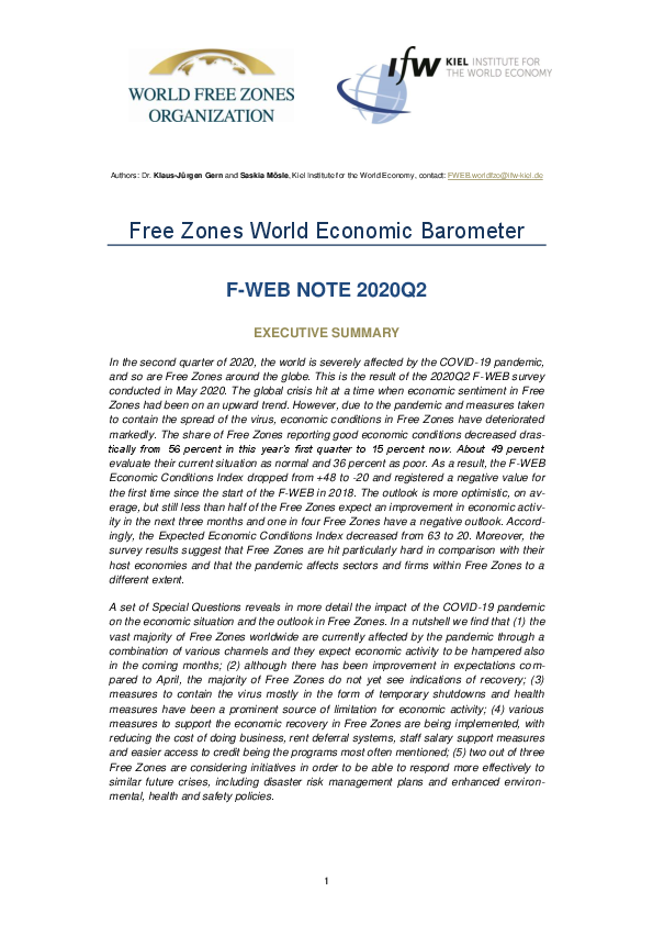 In the second quarter of 2020, the world is severely affected by the COVID-19 pandemic, and so are Free Zones around the globe. This is the result of the 2020Q2 F-WEB survey conducted in May 2020. The global crisis hit at a time when economic sentiment in Free Zones had been on an upward trend. However, due to the pandemic and measures taken to contain the spread of the virus, economic conditions in Free Zones have deteriorated markedly. The share of Free Zones reporting good economic conditions decreased drastically from 56 percent in this year’s first quarter to 15 percent now. About 49 percent evaluate their current situation as normal and 36 percent as poor. As a result, the F-WEB Economic Conditions Index dropped from +48 to -20 and registered a negative value for the first time since the start of the F-WEB in 2018. The outlook is more optimistic, on av-erage, but still less than half of the Free Zones expect an improvement in economic activity in the next three months and one in four Free Zones have a negative outlook. Accordingly, the Expected Economic Conditions Index decreased from 63 to 20. Moreover, the survey results suggest that Free Zones are hit particularly hard in comparison with their host economies and that the pandemic affects sectors and firms within Free Zones to a different extent.