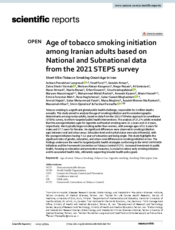 Age of tobacco smoking initiation among Iranian adults based on National and Subnational data from the 2021 STEPS survey