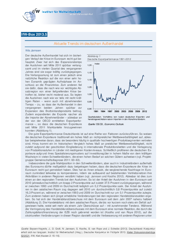 Der deutsche Außenhandel hat sich im bisherigen Verlauf der Krise im Euroraum recht gut behauptet. Zwar hat sich das Expansionstempo der Ausfuhren seit Mitte 2011 spürbar verlangsamt und im vierten Quartal des vergangenen Jahres sind sie sogar kräftig zurückgegangen. Die Verlangsamung ist zum einen jedoch eine natürliche Reaktion auf die von einer sehr hohen Dynamik geprägten Aufholphase im Anschluss an die Finanzkrise. Zum anderen fiel sie dafür, dass die nach wie vor wichtigste Absatzregion von einer tiefgreifenden Krise betroffen ist, bisher recht moderat aus. So legten die Ausfuhren nach wie vor teils mit recht kräftigen Raten – wenn auch mit abnehmenden Tempo – zu, so dass der Außenhandel in den vergangenen beiden Jahren spürbar zur Expansion des Bruttoinlandsprodukts beitrug. Zudem expandierten die Exporte rascher als die Importe der Abnehmerländer – ablesbar an der von der OECD ermittelten Exportperformance –, so dass die deutschen Exporteure seit Mitte 2011 Marktanteile hinzugewinnen konnten.