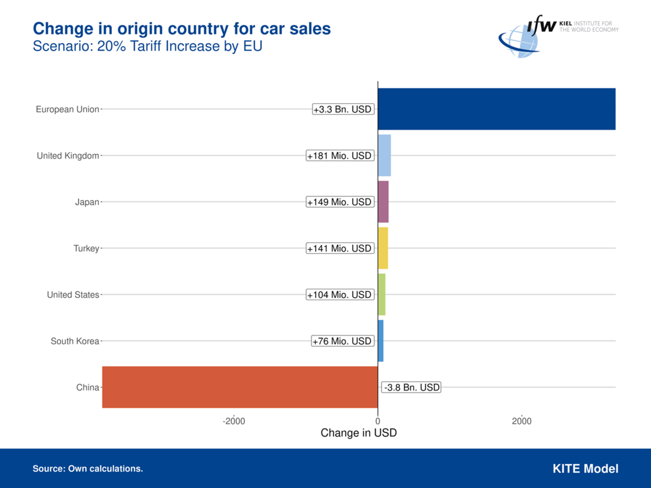 Die Einführung der Zölle wird spürbare Effekte haben. Aktuelle Berechnungen mit dem KITE-Modell des IfW Kiel zeigen, dass EU-Zölle von dann insgesamt ca. 31 Prozent auf chinesische Elektroautos zu einem Rückgang der Elektroauto-Importe aus China von rund 25 Prozent führen könnten. Das entspricht einem Wert von rund 4 Mrd. US-Dollar.