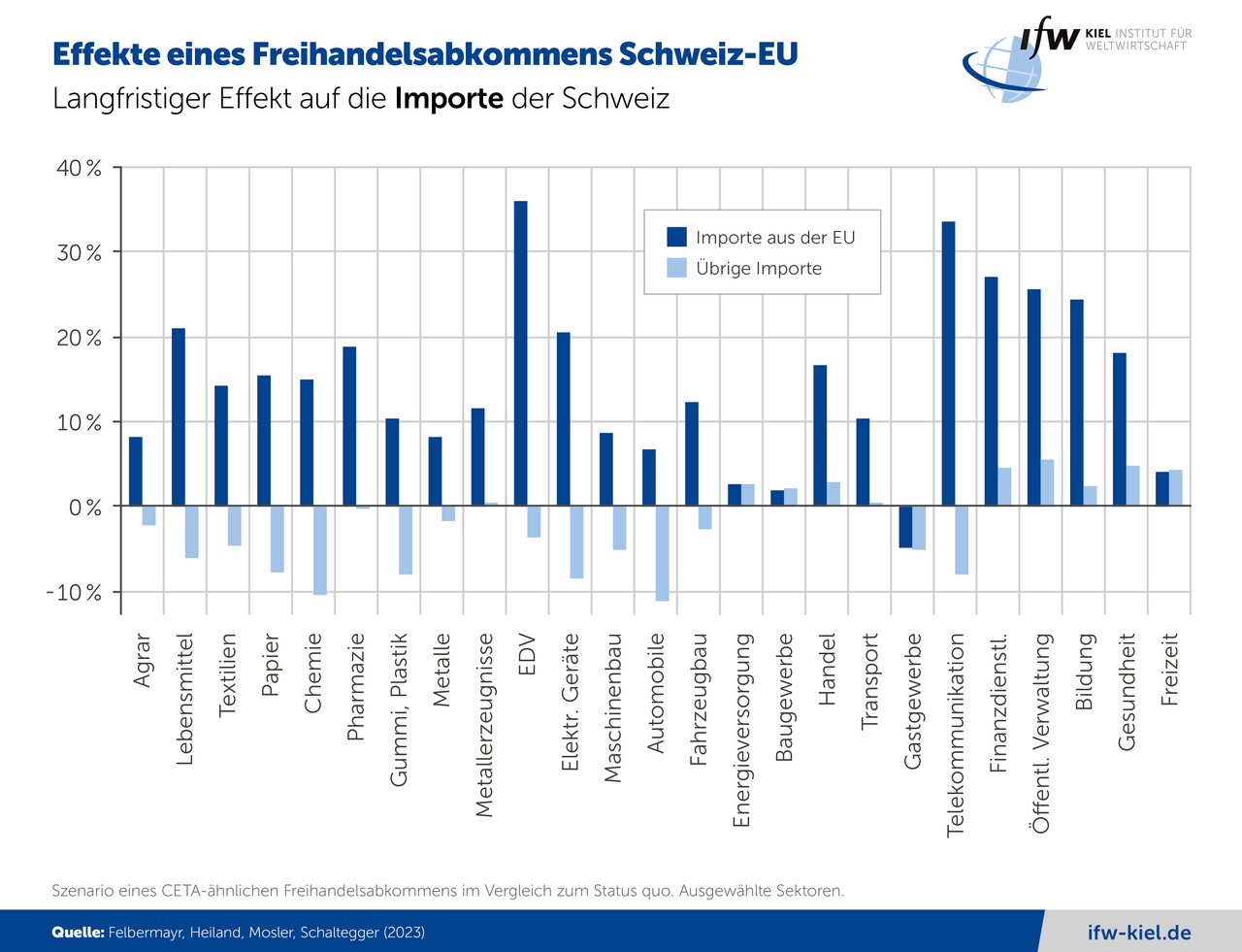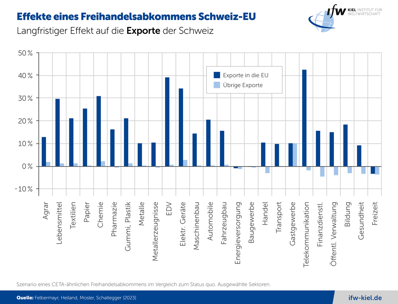 Ein Freihandelsabkommen zwischen der EU und der Schweiz nach Vorbild des CETA-Abkommens mit Kanada würde die Schweizer Wertschöpfung dauerhaft um 1,5 Prozent steigern und die Realeinkommen um 2,4 Prozent erhöhen. Zudem sind keine spürbaren ökonomischen Verwerfungen zwischen Schweizer Wirtschaftssektoren oder mit Handelspartnern zu erwarten. Das zeigt eine neue Studie des Kiel Instituts für Weltwirtschaft (IfW Kiel), des Österreichischen Wirtschaftsforschungsinstituts (WIFO) in Wien und des Instituts für Schweizer Wirtschaftspolitik (IWP) in Luzern.