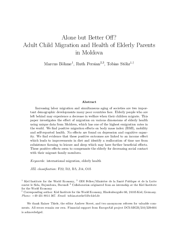 Alone but Better Off? Adult Child Migration and Health of Elderly Parents in Moldova