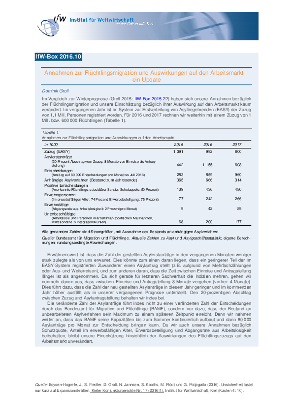 Annahmen zur Flüchtlingsmigration und Auswirkungen auf den Arbeitsmarkt - ein Update