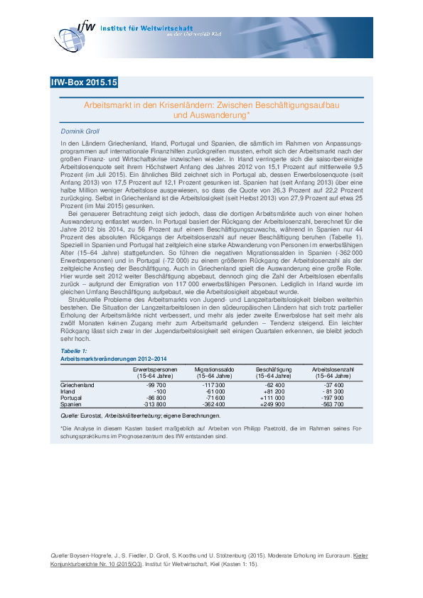 In den Ländern Griechenland, Irland, Portugal und Spanien, die sämtlich im Rahmen von Anpassungsprogrammen auf internationale Finanzhilfen zurückgreifen mussten, erholt sich der Arbeitsmarkt nach der großen Finanz- und Wirtschaftskrise inzwischen wieder. In Irland verringerte sich die saisonbereinigte Arbeitslosenquote seit ihrem Höchstwert Anfang des Jahres 2012 von 15,1 Prozent auf mittlerweile 9,5 Prozent (im Juli 2015). Ein ähnliches Bild zeichnet sich in Portugal ab, dessen Erwerbslosenquote (seit Anfang 2013) von 17,5 Prozent auf 12,1 Prozent gesunken ist. Spanien hat (seit Anfang 2013) über eine halbe Million weniger Arbeitslose ausgewiesen, so dass die Quote von 26,3 Prozent auf 22,2 Prozent zurückging. Selbst in Griechenland ist die Arbeitslosigkeit (seit Herbst 2013) von 27,9 Prozent auf etwa 25 Prozent (im Mai 2015) gesunken.