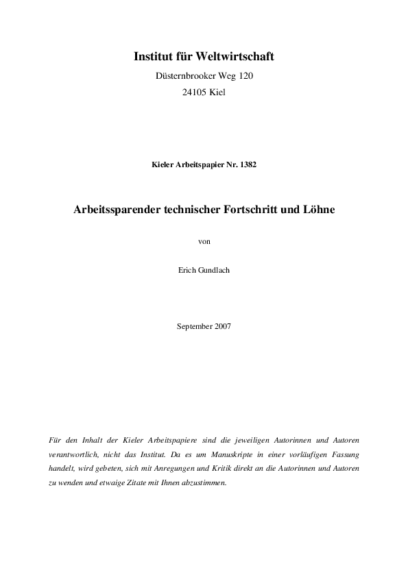 Einfache Lehrbuchmodelle liefern widersprüchliche Aussagen zu den Wirkungen eines arbeitssparenden technischen Fortschritts auf die Löhne. Ein Modell der offenen Volkswirtschaft mit zwei Diversifizierungskegeln zeigt verschiedene Möglichkeiten auf, wie der arbeitssparende technische Fortschritt die Löhne beeinflussen könnte. Wenn der arbeitssparende technische Fortschritt am stärksten im humankapitalintensivsten Sektor wirkt, lässt sich für einen bestimmten Modellrahmen zeigen, dass die relativen Einkommensunterschiede innerhalb des Diversifizierungskegels der reichen Länder zunehmen und die Einkommensunterschiede zwischen den beiden Diversifizierungskegeln abnehmen werden. Danach kann der arbeitssparende technische Fortschritt anders als in einfachen Lehrbuchmodellen der Wachstums- und Außenwirtschaftstheorie die relativen Löhne der wenig qualifizierten Beschäftigten in den Industrieländern verringern.