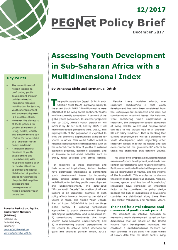 The youth population (aged 15-24) in sub-Saharan Africa (SSA) is growing rapidly to the extent that in 2015, 226 million youths were estimated to be living on the continent. Youths in Africa currently account for 19 per cent of the global youth population. It is further projected that by 2030, Africa’s youth population will increase by 42 per cent, and by 2055 it will more than double (United Nations, 2015). This rapid growth of the population is expected to limit the economic opportunities available for youths in Africa. This could further result in negative socioeconomic consequences such as the reduced contribution of youths to national economic progress, economic exclusion, and an increase in anti-social activities such as crime, rebel activities and armed conflict.