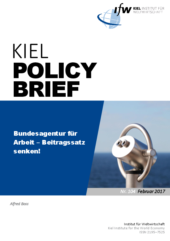 Die Bundesagentur für Arbeit erwirtschaftet seit Jahren erhebliche Überschüsse. Ihre Rücklagen beliefen sich Ende 2016 auf 11 Mrd. Euro. Die Überschüsse sind struktureller Art, nicht konjunkturbedingt. Daher befürwortet der Kieler Ökonom Alfred Boss, dass der Beitragssatz rasch von 3 auf 2,7 Prozent gesenkt werden sollte. So ließen sich der Anstieg der gesamten Belastung durch Sozialversicherungsbeiträge und die Zunahme der Arbeitskosten, zu denen es Anfang 2017 kam, rückgängig machen – mit positiven Folgen für die Beschäftigung.
