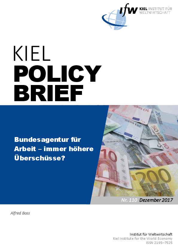Die Bundesagentur für Arbeit erwirtschaftet seit Jahren erhebliche Überschüsse, wie der Autor Alfred Boss in seine Analyse zeigt. Die Überschüsse sind im Wesentlichen struktureller Art, nicht konjunkturbedingt. Der Beitragssatz sollte ab Beginn des Jahres 2018 von 3 auf 2,5 Prozent gesenkt werden. So ließen sich der Anstieg der gesamten Belastung durch Sozialversicherungsbeiträge und die Zunahme der Arbeitskosten, zu denen es Anfang 2017 kam, rückgängig machen – mit positiven Folgen für die Beschäftigung.