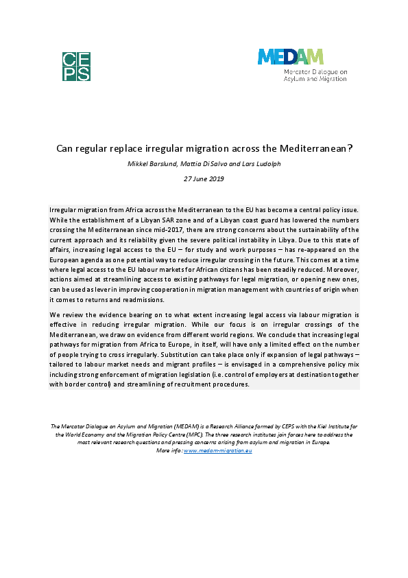 We review the evidence bearing on to what extent increasing legal access via labour migration is effective in reducing irregular migration. While our focus is on irregular crossings of the Mediterranean, we draw on evidence from different world regions. We conclude that increasing legal pathways for migration from Africa to Europe, in itself, will have only a limited effect on the number of people trying to cross irregularly. Substitution can take place only if expansion of legal pathways—tailored to labour market needs and migrant profiles—is envisaged in a comprehensive policy mix including strong enforcement of migration legislation (i.e. control of employers at destination together with border control) and streamlining of recruitment procedures.