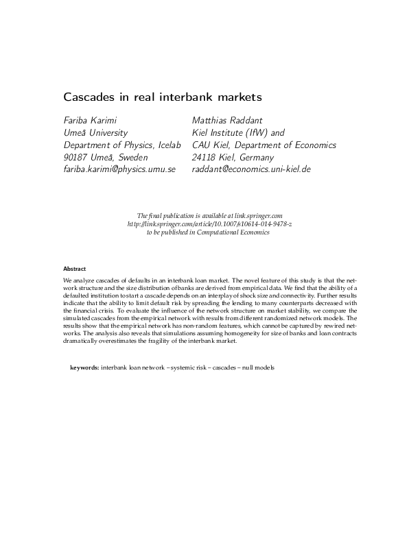 simulated cascades from the empirical network with results from different randomized network models. The results show that the empirical network has non-random features, which cannot be captured by rewired networks. The analysis also reveals that simulations assuming homogeneity for size of banks and loan contracts dramatically overestimates the fragility of the interbank market.
