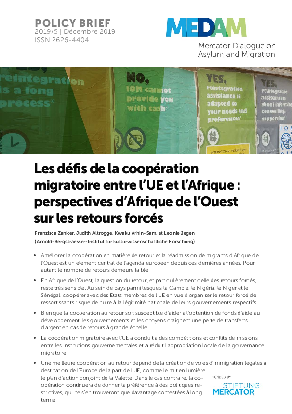 - Improving cooperation on the return and readmission of West African migrants has been central for the EU in recent years, yet return numbers remain low. In West Africa, the issue of return, and in particular forced return, remains highly sensitive. Cooperating with EU member states on forced return may hurt the domestic legitimacy of governments in countries like the Gambia, Nigeria, Niger, and Senegal.While cooperation on return may help to attract development funds, governments and citizens fear a loss of remittances in the case of large-scale returns.Migration cooperation with the EU has led to competition and conflicts over mandates between government institutions and reduced local ownership of migration governance. Better cooperation on return depends on the EU expanding opportunities for legal migration to Europe, as highlighted by the Valetta action plan. Otherwise, cooperation would remain biased toward restrictive policies, which will only become more contested in the long run.