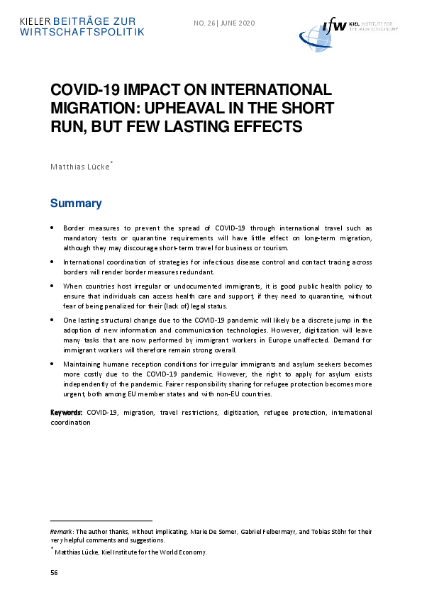 - Die Covid-19-Pandemie wird noch lange zu Beschränkungen des internationalen Reiseverkehrs führen, etwa durch verpflichtende Tests oder Quarantäne. Solche Beschränkungen werden kurze Urlaubs- oder Geschäftsreisen härter treffen als langfristig angelegte internationale Migration.