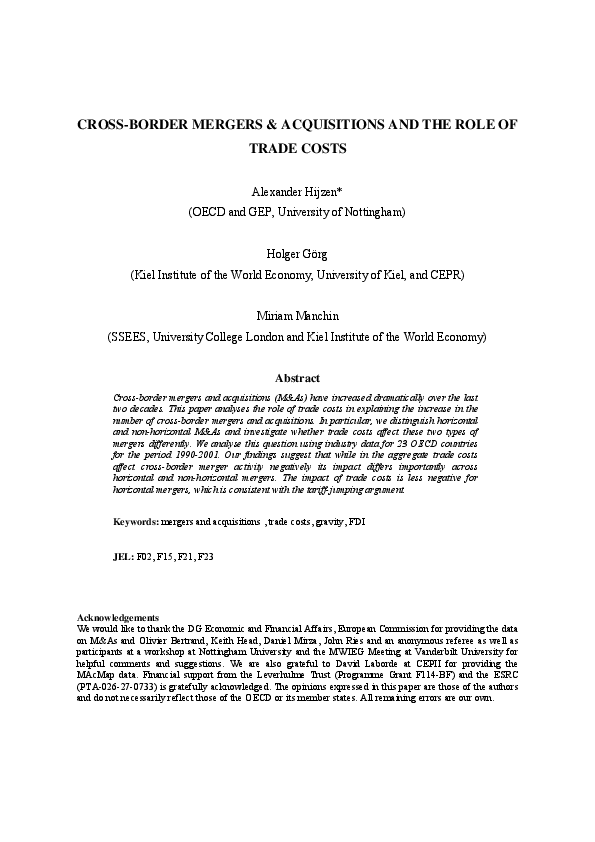 Cross-border mergers and acquisitions (M&As) have increased dramatically over the last two decades. This paper analyses the role of trade costs in explaining the increase in the number of cross-border M&As. In particular, we distinguish horizontal and non-horizontal M&As and investigate whether trade costs affect these two types of mergers differently. We analyse this question using industry data for 23 OECD countries for the period 1990–2001. Our findings suggest that while in the aggregate trade costs affect cross-border merger activity negatively its impact differs importantly across horizontal and non-horizontal mergers. The impact of trade costs is less negative for horizontal mergers, which is consistent with the tariff-jumping argument.