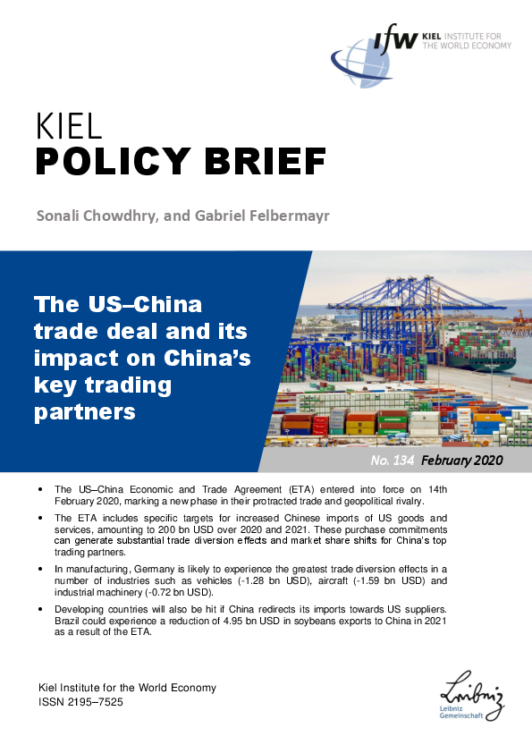 Das Wirtschafts- und Handelsabkommen (ETA) zwischen den USA und China trat am 14. Februar 2020 in Kraft und eröffnete eine neue Phase in der schon langandauenden handels- und geopolitischen Rivalität zwischen beiden Ländern. Das ETA enthält spezifische Ziele für die Erhöhung der chinesischen Importe von US-Gütern und -Dienstleistungen in Höhe von 200 Mrd. US-Dollar für die Jahre 2020 und 2021. Die Autoren zeigen, dass diese Abnahmeverpflichtungen erhebliche Handelsumlenkungseffekte und Marktanteilsverschiebungen für Chinas wichtigste Handelspartner zur Folge haben können. Im Verarbeitenden Gewerbe dürfte Deutschland von den größten Handelsumlenkungseffekten in einer Reihe von Branchen wie Fahrzeuge (-1,28 Mrd. US-Dollar), Flugzeuge (-1,59 Mrd. US-Dollar) und Industriemaschinen (-0,72 Mrd. US-Dollar) betroffen sein. Ebenso werden Entwicklungsländer die Auswirkungen des ETA spüren, wenn China seine Importe auf US-Lieferanten umleitet. Alleine Brasilien könnte im Jahr 2021 infolge des ETA einen Rückgang der Sojabohnenexporte nach China um 4,95 Mrd. US-Dollar erleiden.