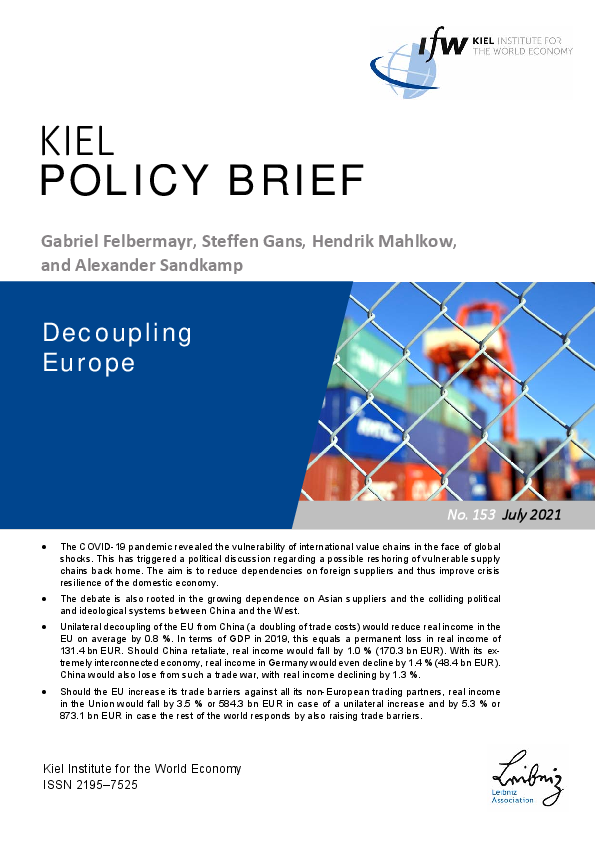 Eine einseitige Abkopplung der EU von China würde die Wohlfahrt über alle EU-Mitgliedsstaaten im Durchschnitt um 0,8 Prozent reduzieren. Gemessen am BIP 2019 entspräche dies einem dauerhaften Einkommensverlust in Höhe von 131,4 Mrd. EUR. Sollte China zurückschlagen, so würde das Realeinkommen um 1 Prozent sinken (170,3 Mrd. EUR). Aufgrund seiner starken internationalen Verflechtungen wäre Deutschland mit einem Einkommensverlust in Höhe von 1,4 Prozent (48,4 Mrd. EUR) besonders stark betroffen. China würde durch solch einen Handelskrieg Einkommenseinbußen in Höhe von 1,3 Prozent erleiden.