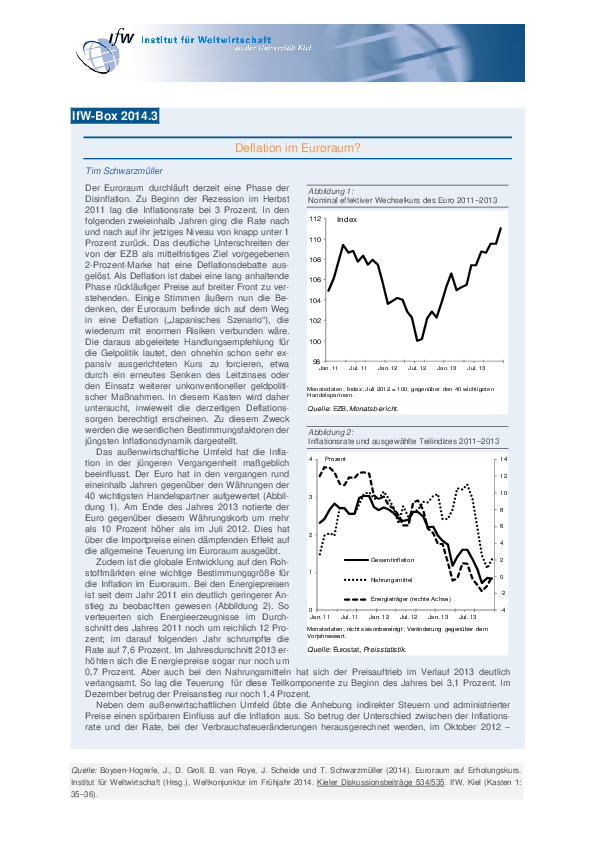 Der Euroraum durchläuft derzeit eine Phase der Disinflation. Zu Beginn der Rezession im Herbst 2011 lag die Inflationsrate bei 3 Prozent. In den folgenden zweieinhalb Jahren ging die Rate nach und nach auf ihr jetziges Niveau von knapp unter 1 Prozent zurück. Das deutliche Unterschreiten der von der EZB als mittelfristiges Ziel vorgegebenen 2-Prozent-Marke hat eine Deflationsdebatte ausgelöst. Als Deflation ist dabei eine lang anhaltende Phase rückläufiger Preise auf breiter Front zu verstehenden. Einige Stimmen äußern nun die Bedenken, der Euroraum befinde sich auf dem Weg in eine Deflation („Japanisches Szenario“), die wiederum mit enormen Risiken verbunden wäre. Die daraus abgeleitete Handlungsempfehlung für die Gelpolitik lautet, den ohnehin schon sehr expansiv ausgerichteten Kurs zu forcieren, etwa durch ein erneutes Senken des Leitzinses oder den Einsatz weiterer unkonventioneller geldpolitischer Maßnahmen. In diesem Kasten wird daher untersucht, inwieweit die derzeitigen Deflationssorgen berechtigt erscheinen. Zu diesem Zweck werden die wesentlichen Bestimmungsfaktoren der jüngsten Inflationsdynamik dargestellt.