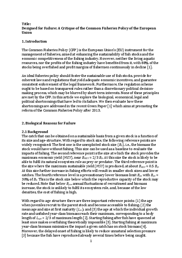 The Common Fisheries Policy (CFP) of the European Union has neither lived up to its aim of enhancing the sustainability of fish stocks nor that of improving the economic competitiveness of the fishing industry. This paper discusses the failure of the CFP from a biological, economical, legal and political perspective.