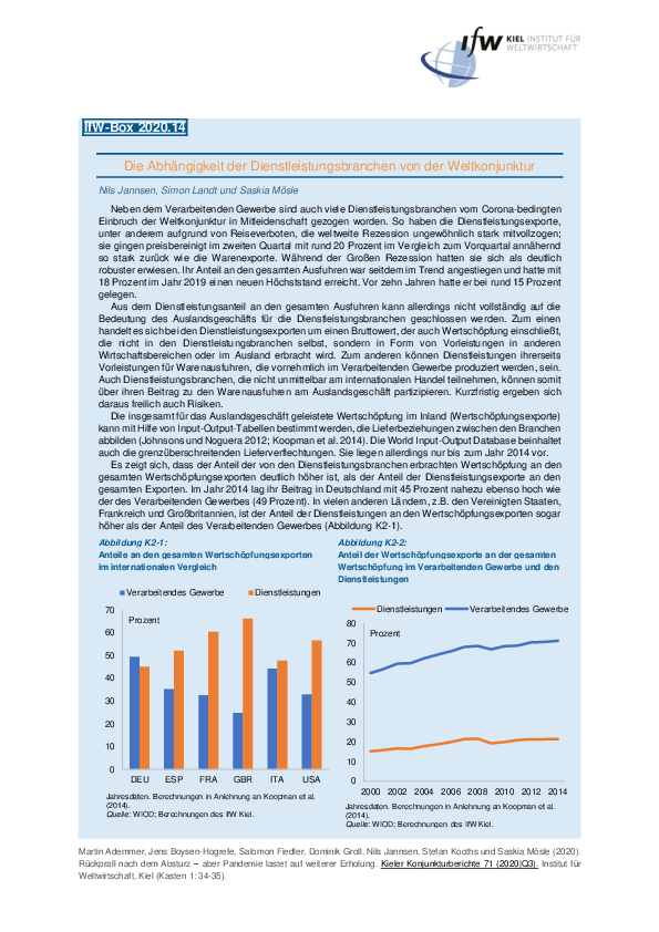 Neben dem Verarbeitenden Gewerbe sind auch viele Dienstleistungsbranchen vom Corona-bedingten Einbruch der Weltkonjunktur in Mitleidenschaft gezogen worden. So haben die Dienstleistungsexporte, unter anderem aufgrund von Reiseverboten, die weltweite Rezession ungewöhnlich stark mitvollzogen; sie gingen preisbereinigt im zweiten Quartal mit rund 20 Prozent im Vergleich zum Vorquartal annähernd so stark zurück wie die Warenexporte.