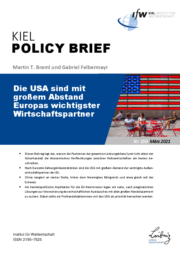 Die Autoren legen dar, warum die Positionen der gesamten Leistungsbilanz und nicht allein der Güterhandel die ökonomischen Verflechtungen zwischen Volkswirtschaften am besten beschreiben. Zahlungsbilanzstatistiken von Eurostat zeigen, dass die USA mit großem Abstand der wichtigste Außenwirtschaftspartner der EU sind, während China hinter dem Vereinigten Königreich und etwa gleichauf mit der Schweiz an vierter Stelle rangiert. Als handelspolitische Implikation für die EU-Kommission legen die Autoren nahe, nach pragmatischen Lösungen zur Intensivierung des wirtschaftlichen Austausches mit allen großen Handelspartnern zu suchen. Dabei sollte ein Freihandelsabkommen mit den USA als prioritär betrachtet werden.