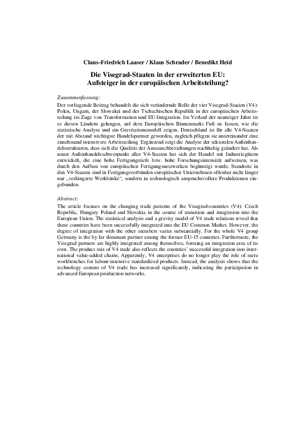 Der vorliegende Beitrag behandelt die sich verändernde Rolle der vier Visegrad-Staaten (V4): Polen, Ungarn, der Slowakei und der Tschechischen Republik in der europäischen Arbeitsteilung im Zuge von Transformation und EU-Integration. Im Verlauf der neunziger Jahre ist es diesen Ländern gelungen, auf dem Europäischen Binnenmarkt Fuß zu fassen, wie die statistische Analyse und ein Gravitationsmodell zeigen. Deutschland ist für alle V4-Staaten der mit Abstand wichtigste Handelspartner geworden, zugleich pflegen sie untereinander eine zunehmend intensivere Arbeitsteilung Ergänzend zeigt die Analyse der sektoralen Außenhandelsstrukturen, dass sich die Qualität der Austauschbeziehungen nachhaltig geändert hat. Als neuer Außenhandelsschwerpunkt aller V4-Staaten hat sich der Handel mit Industriegütern entwickelt, die eine hohe Fertigungstiefe bzw. hohe Forschungsintensität aufweisen, was durch den Aufbau von europäischen Fertigungsnetzwerken begünstigt wurde. Standorte in den V4-Staaten sind in Fertigungsverbünden europäischer Unternehmen offenbar nicht länger nur „verlängerte Werkbänke“, sondern in technologisch anspruchsvollere Produktionen eingebunden.