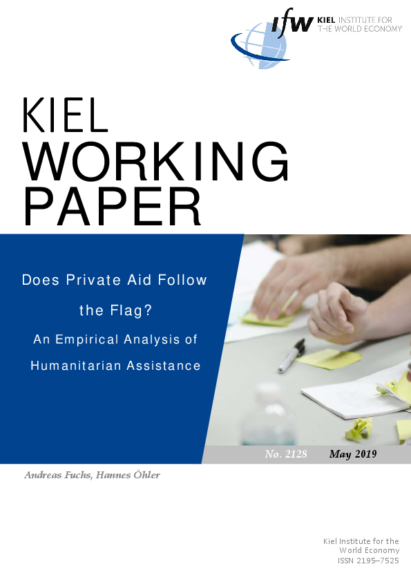 Little is known about foreign aid provided by private donors. This paper contributes to closing this research gap by comparing the allocation of private humanitarian aid to that of official humanitarian aid awarded to 140 recipient countries over the 2000-2016 period. We construct a new database that offers information on the country in which the headquarters of private donors are located to test whether private donors follow the aid allocation pattern of their home country. Our empirical results confirm that private aid “follows the flag.” This finding is robust against the inclusion of various fixed effects, estimating instrumental variables models, and disaggregating private aid into corporate aid and NGO aid. Donor country-specific estimations reveal that private aid from China, Sweden, the United Kingdom, and the United States “follow the flag.”