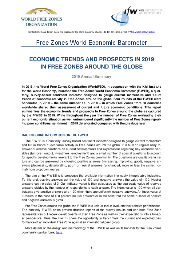 Four rounds of the F-WEB were conducted in 2019 – the same number as in 2018 – in which Free Zones from 68 countries worldwide shared their assessment of current and future economic conditions. This report summarizes the economic trends and prospects in Free Zones around the globe as captured by the F-WEB in 2019. While throughout the year the number of Free Zones evaluating their current economic situation as well outnumbered significantly the number of Free Zones report-ing poor conditions, sentiment in 2019 deteriorated compared with the previous year.
