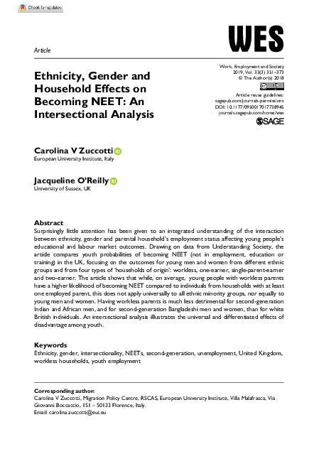Surprisingly little attention has been given to an integrated understanding of the interaction between ethnicity, gender and parental household’s employment status affecting young people’s educational and labour market outcomes. Drawing on data from Understanding Society, the article compares youth probabilities of becoming NEET (not in employment, education or training) in the UK, focusing on the outcomes for young men and women from different ethnic groups and from four types of ‘households of origin’: workless, one-earner, single-parent-earner and two-earner. The article shows that while, on average, young people with workless parents have a higher likelihood of becoming NEET compared to individuals from households with at least one employed parent, this does not apply universally to all ethnic minority groups, nor equally to young men and women. Having workless parents is much less detrimental for second-generation Indian and African men, and for second-generation Bangladeshi men and women, than for white British individuals. An intersectional analysis illustrates the universal and differentiated effects of disadvantage among youth.