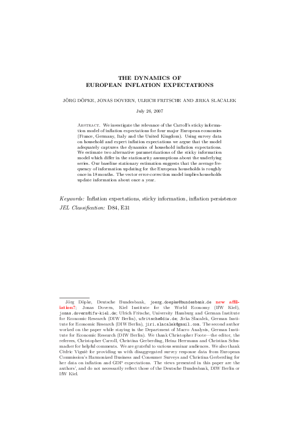 This paper investigates the relevance of the sticky information model of Mankiw and Reis (2002) and Carroll (2003) for four major European economies (France, Germany, Italy and the United Kingdom). As opposed to the benchmark rational expectation models, households in the sticky information environment update their expectations sporadically rather than instantaneously owing to the costs of acquiring and processing information. We estimate two alternative parametrizations of the sticky information model which differ in the stationarity assumptions about the underlying series. Using survey data on households’ and experts’ inflation expectations, we find that the model adequately captures the dynamics of household inflation expectations. Both parametrizations imply comparable speeds of information updating for the European households as was previously found in the US, on average roughly once a year.