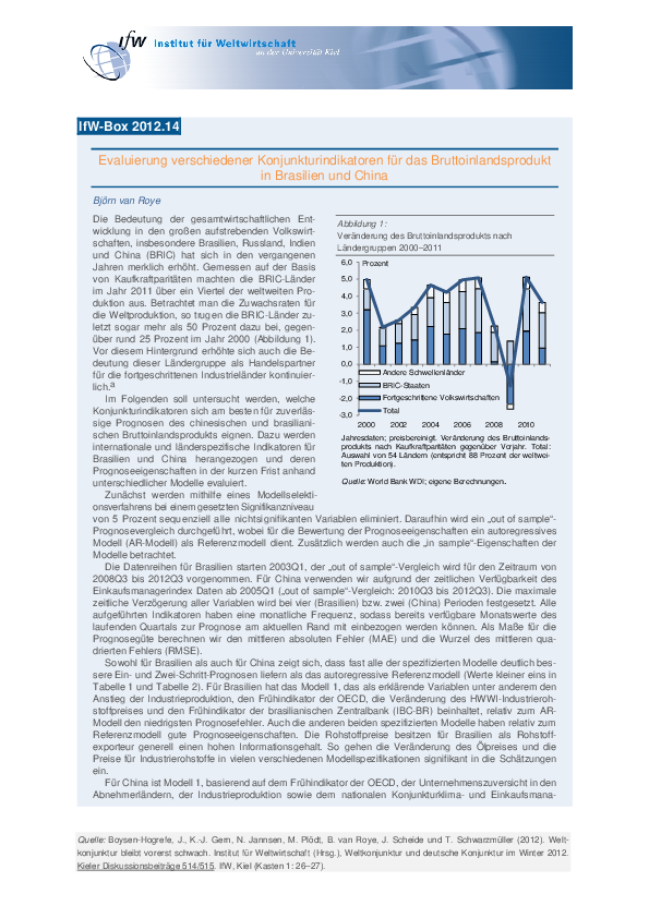 Die Bedeutung der gesamtwirtschaftlichen Entwicklung in den großen aufstrebenden Volkswirtschaften, insbesondere Brasilien, Russland, Indien und China (BRIC) hat sich in den vergangenen Jahren merklich erhöht. Gemessen auf der Basis von Kaufkraftparitäten machten die BRIC-Länder im Jahr 2011 über ein Viertel der weltweiten Produktion aus. Betrachtet man die Zuwachsraten für die Weltproduktion, so trugen die BRIC-Länder zuletzt sogar mehr als 50 Prozent dazu bei, gegenüber rund 25 Prozent im Jahr 2000. Vor diesem Hintergrund erhöhte sich auch die Bedeutung dieser Ländergruppe als Handelspartner für die fortgeschrittenen Industrieländer kontinuierlich.