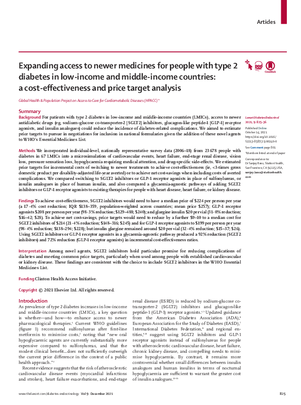 Findings: To achieve cost-effectiveness, SGLT2 inhibitors would need to have a median price of $224 per person per year (a 17·4% cost reduction; IQR $138–359, population-weighted across countries; mean price $257); GLP-1 receptor agonists $208 per person per year (98·3% reduction; $129–488; $240); and glargine insulin $20 per vial (31·0% reduction; $16–42; $28). To achieve net cost-savings, price targets would need to reduce by a further $9–10 to a median cost for SGLT2 inhibitors of $214 (21·4% reduction; $148–316; $245) and for GLP-1 receptor agonists to $199 per person per year (98·4% reduction; $138–294; $228); but insulin glargine remained around $20 per vial (32·4% reduction; $15–37; $26). Using SGLT2 inhibitors or GLP-1 receptor agonists in a glycaemia-agnostic pathway produced a 92% reduction (SGLT2 inhibitors) and 72% reduction (GLP-1 receptor agonists) in incremental cost-effectiveness ratios.