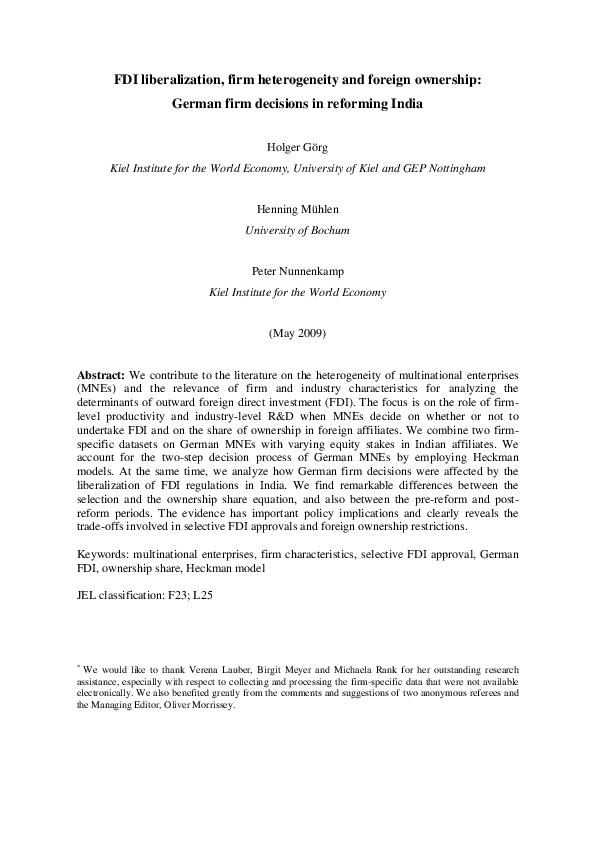 FDI Liberalization, Firm Heterogeneity and Foreign Ownership: German Firm Decisions in Reforming India
