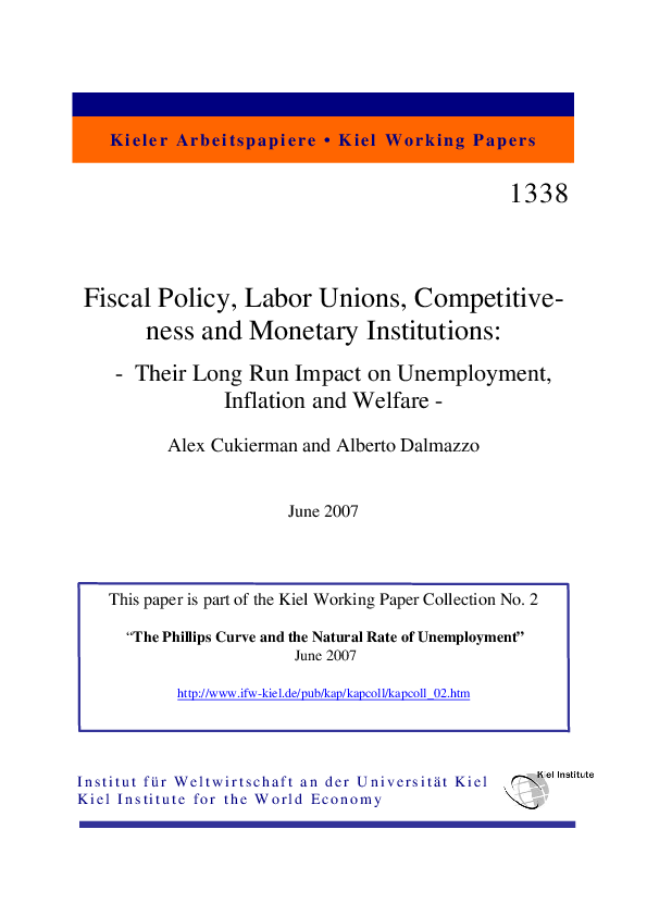 OBJECTIVES AND MOTIVATION: This paper considers the impact of interactions between competitiveness, fiscal policy and monetary institutions in the presence of unionized labor markets on economic outcomes and welfare in the long run. Two main classes of questions are investigated. First, what is the impact of exogenously given labor taxes and unemployment benefits on the choice of monetary policy by the central bank, on the choice of nominal wages by unions, on the choice of prices by monopolistically competitive firms and through them on unemployment, inflation and welfare? A related question is, how does the level of competitiveness on goods’ market affect the economy and welfare? Second, how are labor taxes and redistribution chosen by a (Stackelberg leader) fiscal authority whose objectives are a weighted average of social welfare and of catering to the interests of political supporters, and how does the general equilibrium induced by this choice affect welfare? The framework of the paper is motivated by the European scene in which the fraction of the labor force covered by collective agreements dominates wage setting in the labor market.
