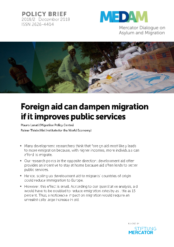 - However, this effect is small. According to our quantitative analysis, aid would have to be doubled to reduce emigration rates by as little as 15 percent. Thus, a noticeable impact on migration would require an unrealistically large increase in aid.