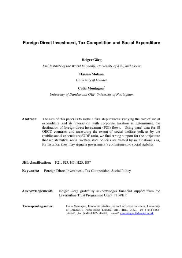 The aim of this paper is to make a first step towards studying the role of social expenditure and its interaction with corporate taxation in determining the destination of foreign direct investment (FDI) flows. Using panel data for 18 OECD countries and measuring the extent of social welfare policies by the (public social expenditure)/GDP ratio, we find strong support for the conjecture that redistributive social welfare state policies are valued by multinationals as, for instance, they may signal a government’s commitment to social stability.