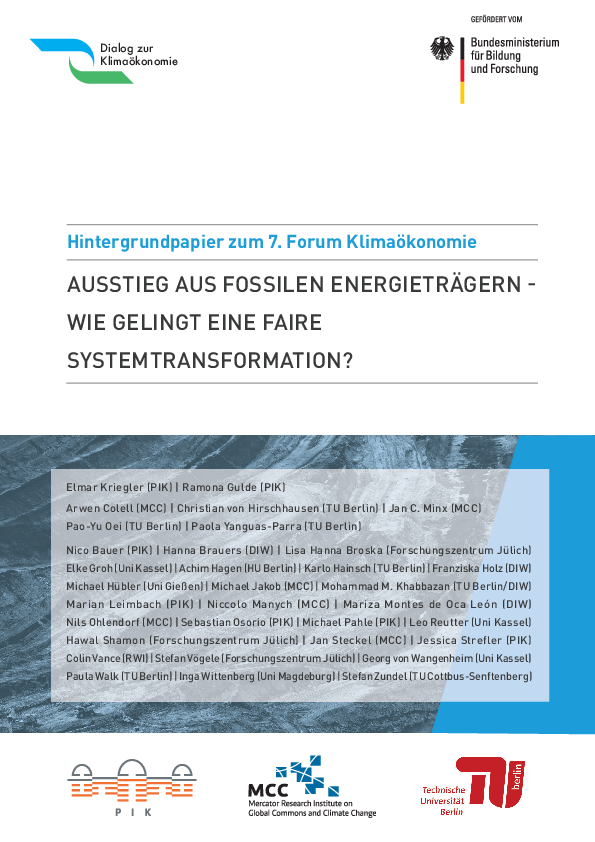 This background paper discusses various aspects that need to be considered when phasing out fossil energy use in order to achieve ambitious climate protection goals. On the one hand, it discusses decarbonization scenarios and phase-out paths for different types of fossil fuels compatible with the Paris Agreement, as well as their manifestation in different sectors and regions. It is shown that such transformation paths are technologically and economically feasible. Second, the paper deals with the political implementation of a fossil fuel phase-out. It becomes clear that there is no one-fits-all solution for a successfull implementation. However, an analysis of existing policies, processes and proposals with the aim of supporting the phase-out of fossil fuels helps to identify effective approaches and how they can be adapted to different regional contexts. A key factor for a successful fossil fuel phase-out is that it is done in a socially just manner. For this reason, potential positive and negative distributive effects of the phase-out on households and consumers on the one hand and on companies and owners of fossil fuels on the other hand is analyzed in the paper.
