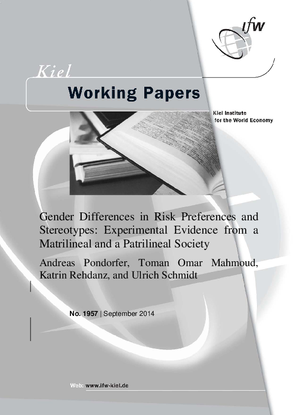 We use a controlled experiment to analyze gender differences in risk preferences and stereotypes about risk preferences of men and women across two distinct island societies in the Pacific: the patrilineal Palawan in the Philippines and the matrilineal Teop in Papua New Guinea. We find no gender differences in actual risk preferences, but evidence for culture-specific stereotypes. Like men in Western societies, Palawan men overestimate women’s actual risk aversion. By contrast, Teop men underestimate women’s actual risk aversion. We argue that observed differences in stereotypes between the two societies are determined by the different social status of women.