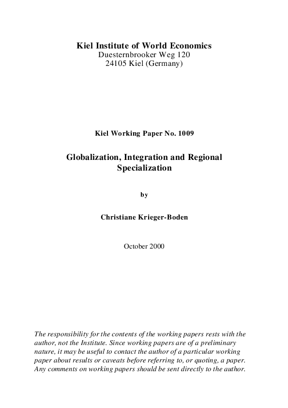 Globalization and European integration are substantially changing the interregional division of labor in Europe and the industrial specialization of European regions, thereby potentially affecting the extent of disparities between countries and regions. This paper reviews several theoretical approaches relevant for explaining regional specialization in the process of integration (such as the new economic geography, urbanization economics, and the theory of comparative advantages), surveys the empirical evidence for European regions, and outlines an agenda for future empirical research.