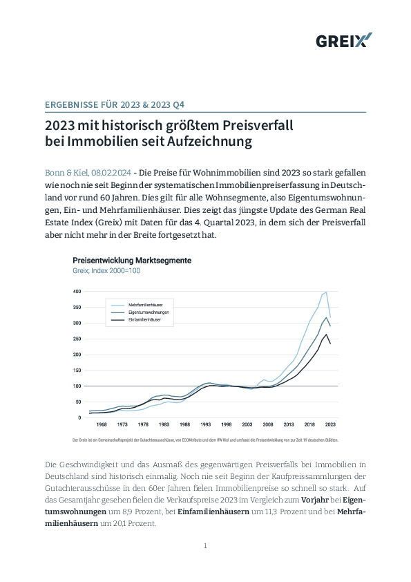Die Preise für Wohnimmobilien sind 2023 so stark gefallen wie noch nie seit Beginn der systematischen Immobilienpreiserfassung in Deutschland vor rund 60 Jahren. Dies gilt für alle Wohnsegmente, also Eigentumswohnungen, Ein- und Mehrfamilienhäuser. Dies zeigt das jüngste Update des German Real Estate Index (Greix) mit Daten für das 4. Quartal 2023, in dem sich der Preisverfall aber nicht mehr in der Breite fortgesetzt hat.