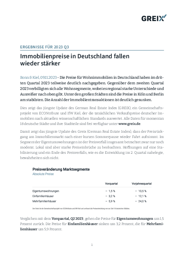 Die Preise für Wohnimmobilien in Deutschland haben im dritten Quartal 2023 teilweise deutlich nachgegeben. Gegenüber dem zweiten Quartal 2023 verbilligten sich alle Wohnsegmente, wobei es regional starke Unterschiede und Ausreißer nach oben gibt. Unter den großen Städten sind die Preise in Köln und Berlin am stabilsten. Die Anzahl der Immobilientransaktionen ist deutlich gesunken. Dies zeigt das jüngste Update des German Real Estate Index (Greix), ein Gemeinschaftsprojekt von ECONtribute und IfW Kiel, der die tatsächlichen Verkaufspreise deutscher Immobilien nach aktuellen wissenschaftlichen Standards auswertet. Alle Daten für momentan 18 deutsche Städte und ihre Stadtteile sind frei verfügbar unter www.greix.de.