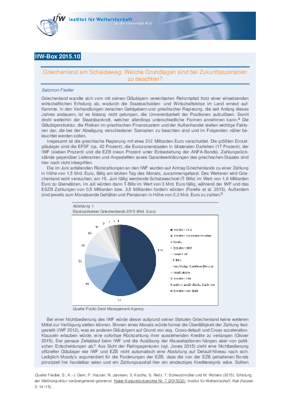 Griechenland wandte sich vom mit seinen Gläubigern vereinbarten Reformpfad trotz einer einsetzenden wirtschaftlichen Erholung ab, wodurch die Staatsschulden- und Wirtschaftskrise im Land erneut aufflammte. In den Verhandlungen zwischen Geldgebern und griechischer Regierung, die seit Anfang dieses Jahres andauern, ist es bislang nicht gelungen, die Unvereinbarkeit der Positionen aufzulösen. Somit droht weiterhin der Staatsbankrott, welcher allerdings unterschiedliche Formen annehmen kann. Die Gläubigerstruktur, die Risiken im griechischen Finanzsystem und der Außenhandel stellen wichtige Faktoren dar, die bei der Abwägung verschiedener Szenarien zu beachten sind und im Folgenden näher beleuchtet werden sollen.