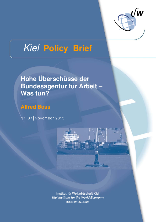 Die Bundesagentur für Arbeit wird nach einer Prognose des Kieler Ökonomen Alfred Boss in den Jahren 2015 und 2016 Überschüsse in der Größenordnung von 3,5 Mrd. Euro erwirtschaften. In seinem Kiel Policy Brief betont der Autor, dass diese Überschüsse in fast vollem Umfang struktureller Art und keineswegs konjunkturbedingt sind. Aus diesem Grund sollte der Beitragssatz zur Arbeitslosenversicherung um 0,3 Prozentpunkte auf 2,7 Prozent des Bruttoarbeitsentgelts gesenkt werden.