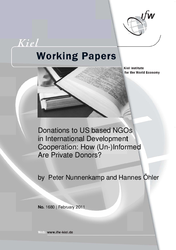 We assess the determinants of private donations across a large sample of US based NGOs with foreign aid activities. Our results show that donations do not depend on publicly available information on NGO characteristics that reveal an efficient and targeted use of funds, notably the efficiency price of NGO aid and the degree of specialisation. Private donors rather rely on the frequently offered option to designate donations to preferred purposes – even though this is unlikely to tie the NGOs’ hands.