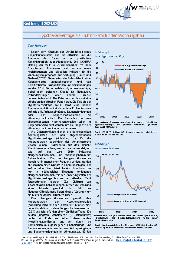 Neben dem Kriterium der Verlässlichkeit eines Konjunkturindikators sind die Aktualität und die Frequenz der Daten in der praktischen Konjunkturarbeit ausschlaggebend. Die SCHUFA Holding AG stellt in Zusammenarbeit mit dem Statistischen Bundesamt seit kurzem einen hochfrequenten und aktuellen Indikator für die Wohnungsbauprognose zur Verfügung (Bauer und Gerhard, 2023).