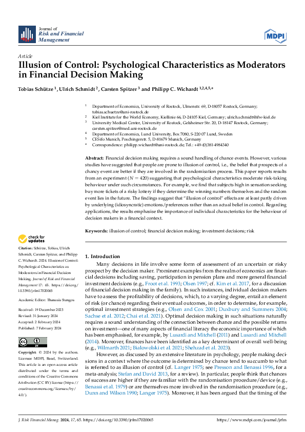 Financial decision making requires a sound handling of chance events. However, various studies have suggested that people are prone to illusion of control, i.e., the belief that prospects of a chancy event are better if they are involved in the randomisation process. This paper reports results from an experiment (?=420) suggesting that psychological characteristics moderate risk-taking behaviour under such circumstances. For example, we find that subjects high in sensation seeking buy more tickets of a risky lottery if they determine the winning numbers themselves and the random event lies in the future. The findings suggest that “illusion of control” effects are at least partly driven by underlying (idiosyncratic) emotions/preferences rather than an actual belief in control. Regarding applications, the results emphasise the importance of individual characteristics for the behaviour of decision makers in a financial context.