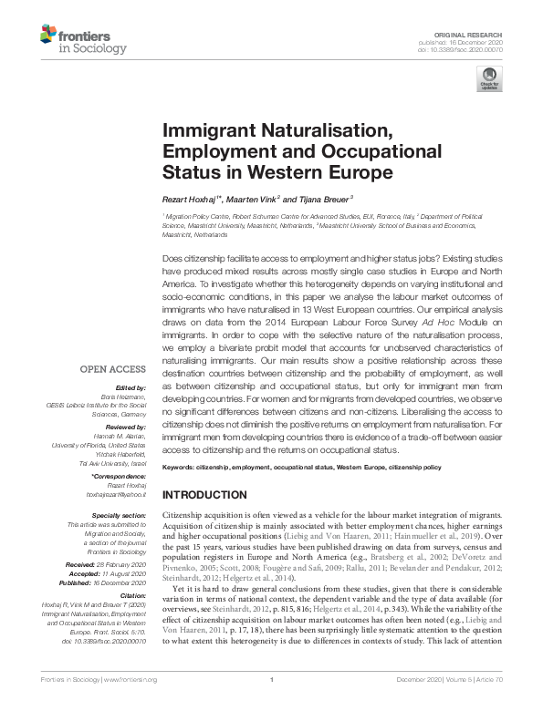 Immigrant Naturalisation, Employment and Occupational Status in Western Europe