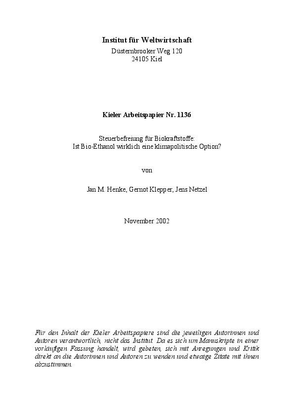 Im Juni 2002 hat der Deutsche Bundestag die Befreiung sämtlicher Biokraftstoffe von der Mineralölsteuer beschlossen. Eine solche Förderung von Biokraftstoffen wird von der Politik durch positive Effekte auf die Klima-, Energie- und Agrarpolitik gerechtfertigt. Das Arbeitspapier analysiert am Beispiel Bio-Ethanol als Benzinsubstitut auf nationaler und internationaler Ebene die Rahmenbedingungen, unter denen die Förderung stattfindet. Gleichzeitig werden anhand von Energie- und Treibhausgasbilanzen die tatsächlichen Auswirkungen der Förderung und einer möglichen vermehrten Verwendung von Bio-Ethanol untersucht. Dabei zeigt sich, dass die Verwendung von Bio-Ethanol zur Reduktion von Treibhausgasemissionen ineffizient ist und günstigere klimapolitische Alternativen zur Verfügung stehen.