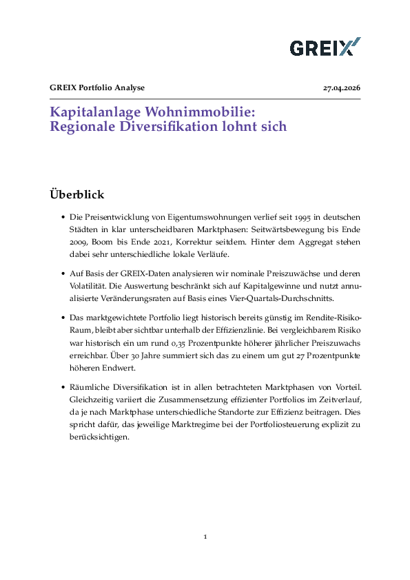 Wohnimmobilien sind für viele Haushalte der größte Vermögensposten, aber als Investment immer an konkrete lokale Märkte gebunden. Der Report untersucht auf Basis von GREIX-Daten für Eigentumswohnungen seit 1995, ob eine Streuung über deutsche Städte das Rendite-Risiko-Profil gegenüber einem marktgewichteten Portfolio verbessert hätte.