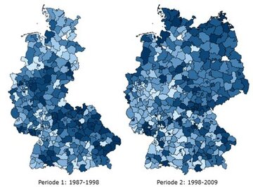 Aus der o.g. Literatur ist bekannt, dass lokale Arbeitsmärkte in Hochlohnländern sehr unterschiedlich vom Handel mit Niedriglohnländern betroffen sind. Einige Regionen profitieren von der Globalisierung, während andere Regionen mit Arbeitsplatzverlusten zu kämpfen haben. Die Unterschiede in den Arbeitsmarkteffekten sollten sich in unterschiedlichen Handelseffekten auf das Wahlverhalten in den betroffenen Gebietseinheiten widerspiegeln. Auf Grundlage der ursprünglichen regionalen Industriestruktur berechnen wir daher, wie stark die einzelnen deutschen Kreise vom zunehmenden Welthandel betroffen sind. Wenn eine Region im Jahr 1987 auf Produktion in Industriesektoren spezialisiert war, die plötzlich in Konkurrenz zu Produzenten in Osteuropa und China stehen, ist diese Region verstärktem Import-Wettbewerb durch günstige Waren aus diesen Ländern ausgesetzt, was Druck auf die lokalen Arbeitsmärkte ausübt. Wenn eine Region hingegen auf Sektoren spezialisiert war, die plötzlich neue Absatzmärkte für ihre Produkte finden, verzeichnet diese Region Export-Möglichkeiten, was stimulierend auf die lokalen Arbeitsmärkte wirkt. Saldiert man die Effekte von Import-Wettbewerb und Export-Möglichkeiten erhält man ein Maß für die regionale Betroffenheit von Handelsintegration insgesamt. Die regionale Verteilung dieses Netto-Maßes ist in Abbildung 2 für die beiden Analyseperioden dargestellt.