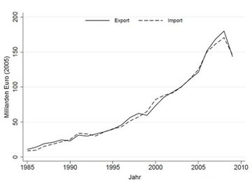 Wir konzentrieren uns auf die Entwicklung des deutschen Außenhandels mit China und Osteuropa über den Zeitraum 1987 bis 2009. Aufgrund zweier historischer Ereignisse nahm der Handel mit diesen Ländern eher unerwartet zu. Der Fall des Eisernen Vorhangs öffnete plötzlich die osteuropäischen Märkte, und mit dem Beitritt zur WHO wurde China schlagartig zum Global Player. Entsprechend verdreifachte sich Deutschlands Handel mit Osteuropa und China über die erste Periode der Betrachtung von 1987 bis 1998, und verdreifachte sich nochmals in der zweiten Periode von 1998 bis 2009 (siehe Abbildung 1). Die Konzentration auf Deutschlands Außenhandel mit diesen Ländern hat zwei Vorteile. Methodisch hilft sie dabei, den Einfluss von Welthandel auf Wahlverhalten zu identifizieren, unabhängig von anderen polit-ökonomischen Entwicklungen die mit der weltweiten Handelsintegration in Zusammenhang stehen. Würde man beispielsweise die Entwicklung des deutschen Handels mit Frankreich oder Großbritannien über denselben Zeitraum betrachten, wäre diese Entwicklung untrennbar verbunden mit der früheren Entwicklung der Europäischen Union, was die Ergebnisse verzerren würde. Darüber hinaus erlaubt der Fokus auf Osteuropa und China einen Vergleich der Ergebnisse mit der bereits bestehenden Literatur zu den Arbeitsmarkteffekten internationalen Handels (Autor et al., 2013, Dauth et al. 2014), welche zur Erklärung der Handelseffekte auf Wahlverhalten herangezogen werden können.